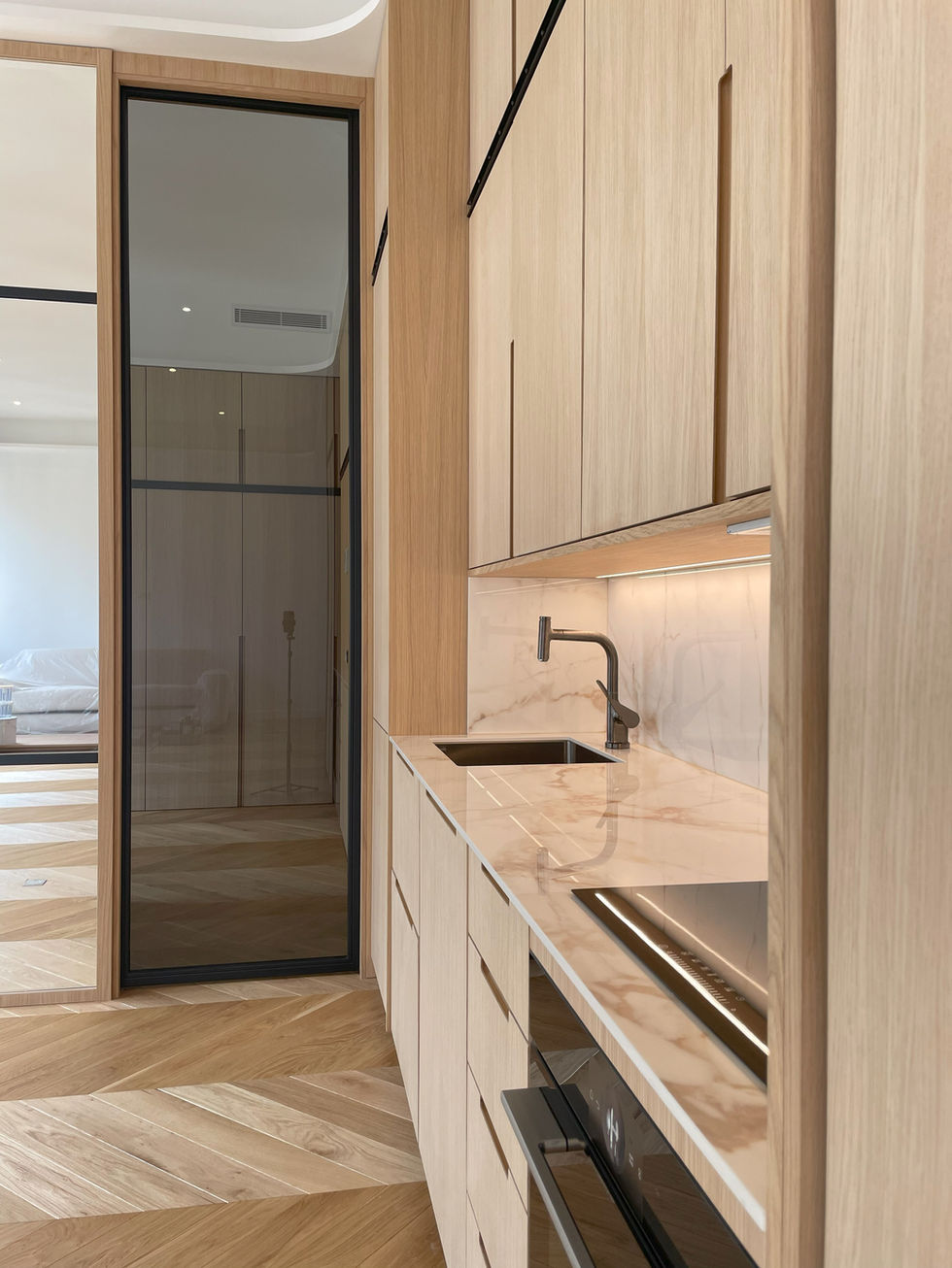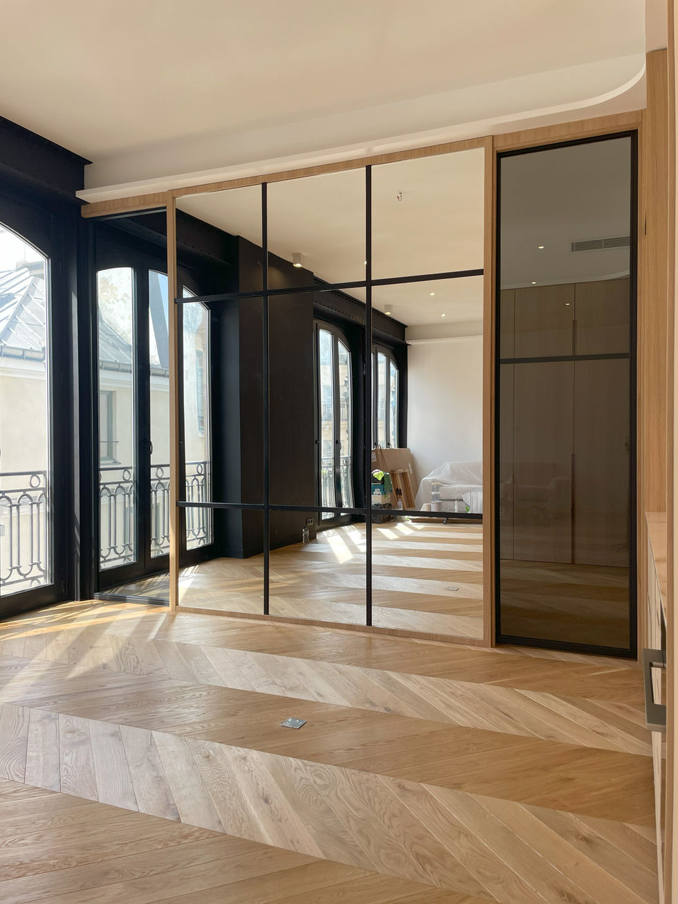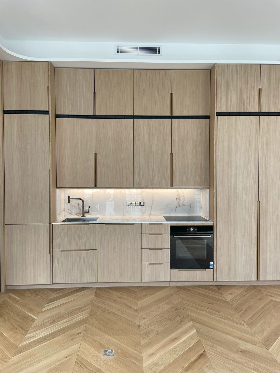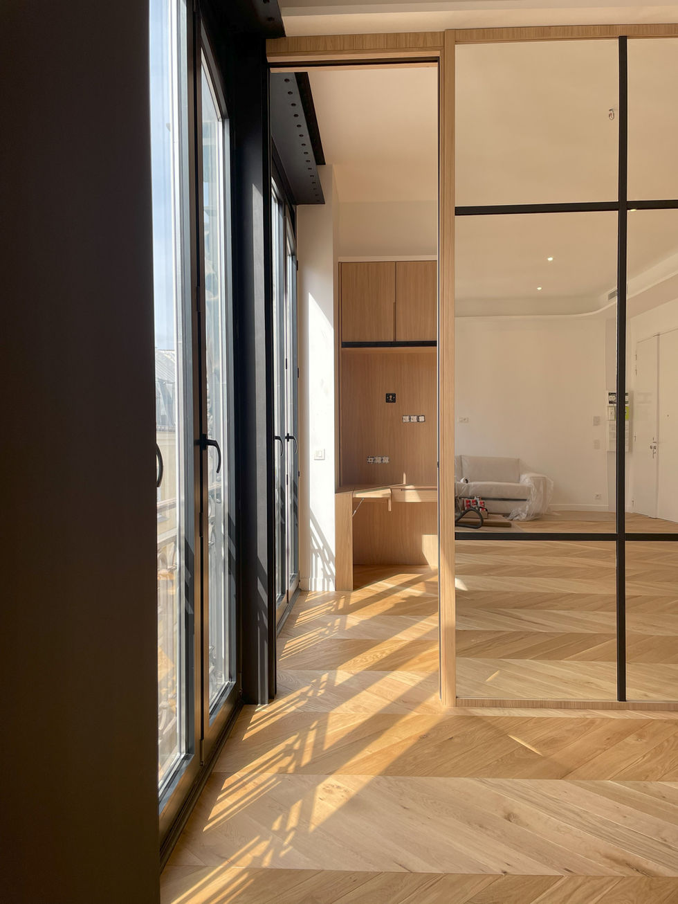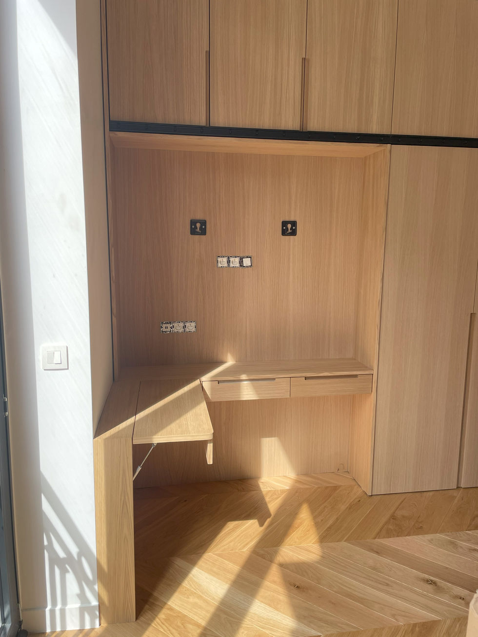 "Dans ce chantier, notre client a fait appel à son architecte pour concevoir sur plan l'intégralité du mobilier. Des contraintes dimensionnelles importantes ont été identifiées, nécessitant une précision absolue pour correspondre aux plans établis. Chaque centimètre a été minutieusement utilisé pour maximiser l'espace disponible, évitant tout gaspillage ou sous-utilisation.