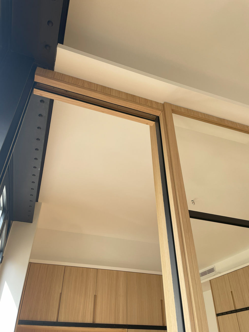 Dans le cadre de nos travaux, nous avons érigé une cloison en bois pour séparer la chambre de la pièce à vivre. Cette cloison a été spécialement conçue pour accueillir deux portes coulissantes de chaque côté, assurant une séparation pratique et fonctionnelle entre les deux espaces.